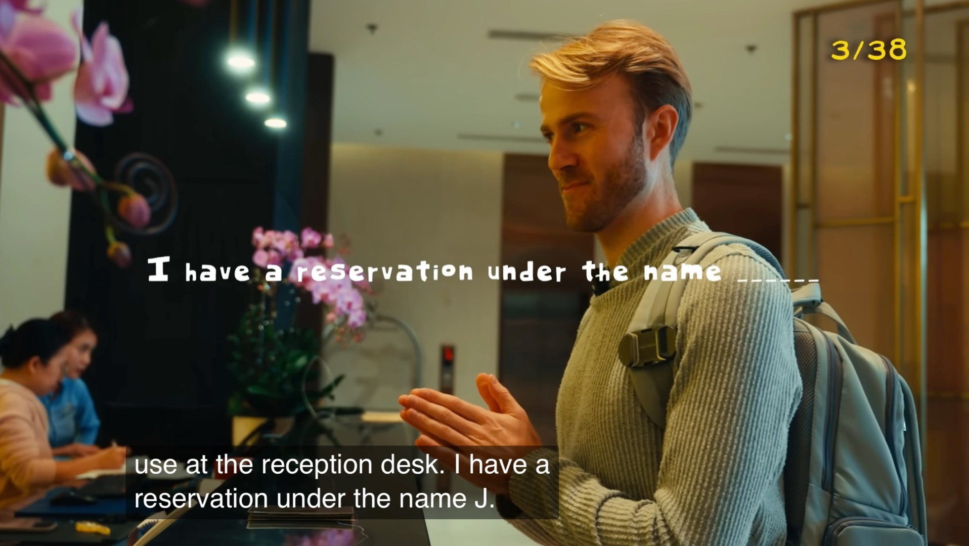 UP主: 封面: 简介:1. 酒店大堂与入住 (Lobby & Check-in)• Revolving door [00:08]:旋转门。• Lobby [00:21]:大堂。• Reception desk / Front desk [00:31]:接待处/前台。• Reception...