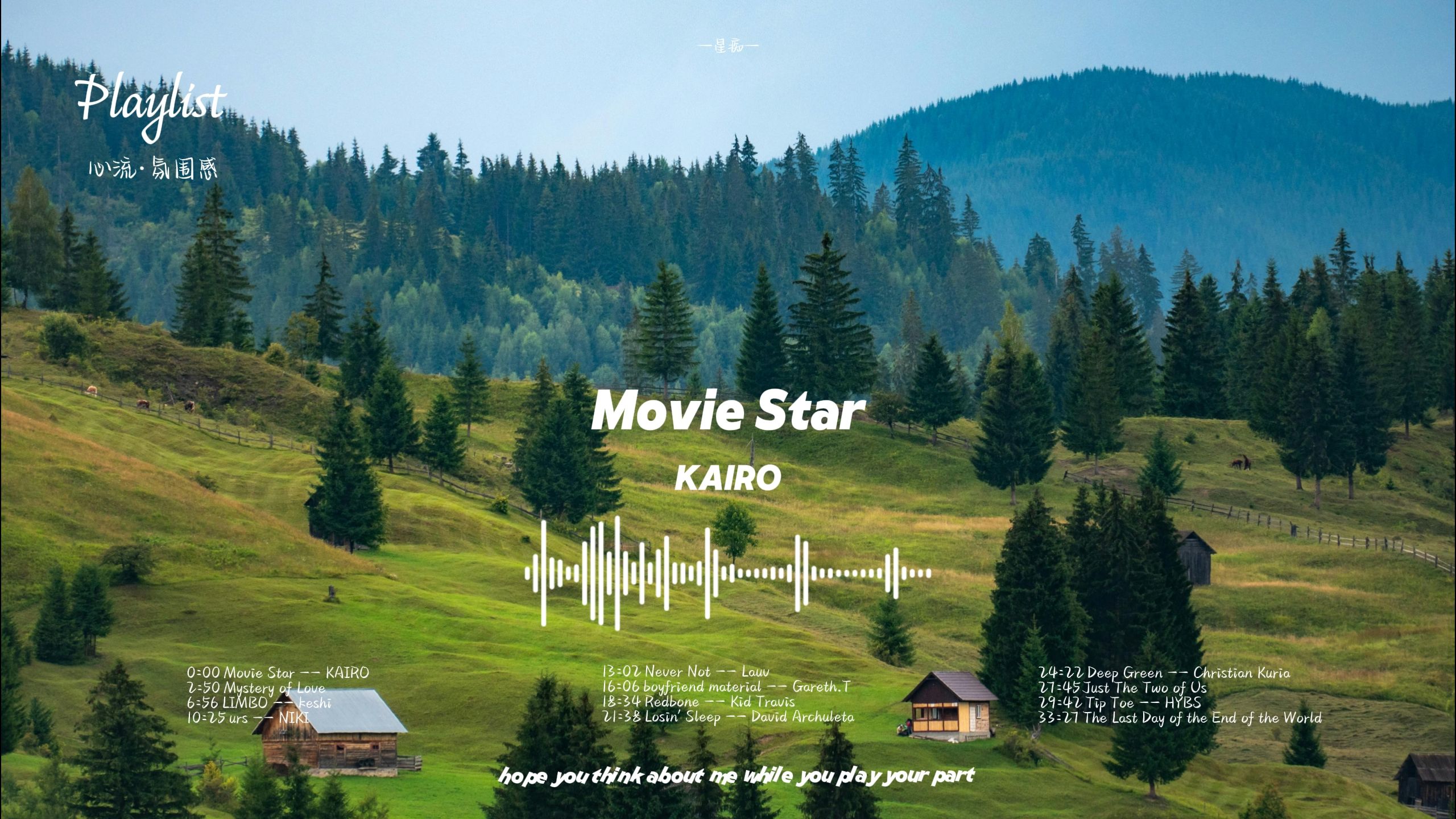 UP主: 封面: 简介:希望你能喜欢今天的歌单!!0:00 Movie Star -- KAIRO2:50 Mystery of Love -- Sufjan Stevens6:56 LIMBO -- keshi10:25 urs -- NIKI13:02 Never Not -- Lauv16:06 boyfrie...