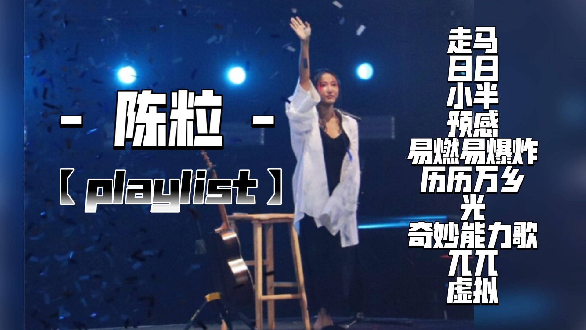 UP主: 封面: 简介:今天是陈粒专场 ~导航:00:00走马03:45日日07:41小半12:39预感18:04易燃易爆炸21:24历历万乡26:05光28:27奇妙能力歌32:40兀兀36:34虚拟...