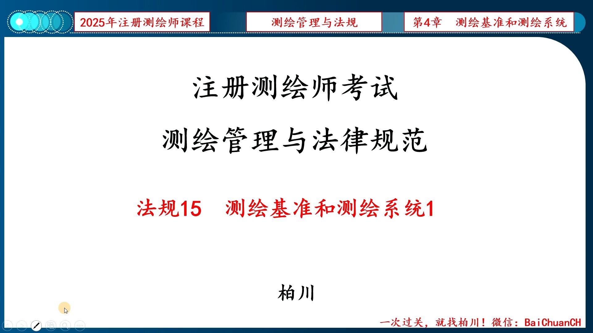柏川测绘的视频 【100】综合043-工程测量09(地下管线测量) 【099】综合042-工程测量08(矿山与隧道工程测量2) 【098】综合041-工程测量07(矿山与隧道工程测量) 【097】综合040-工程测量06(线路与桥梁、水利、市政工程测量) 【096】综合039-工程测量05(城乡规划与建筑工程测量) 【095】综合038-工程测量04(工程地形图2) 【094】综合037-工程测量03(工程地形图) 【093】综合036-工程测量02(工程控制网) 【092】综合035-工程测量01(工程测量的含义和分类+工程控制网1) 【091】综合034-海洋测绘08(质量控制+习题) 【090】综合033-海洋测绘07(海图制图02) 【089】综合032-海洋测绘06(海图制图01) 【088】综合031-海洋测绘05(海洋测量04) 【087】综合030-海洋测绘04(海洋测量03) 【086】综合029-海洋测绘03(海洋测量02) 【085】综合028-海洋测绘02(海洋测量01) 【084】综合027-海洋测绘01(海洋测绘基础) 【015】法规14-项目管理2-习题 【014】法规13-项目管理1 【013】法规12-资质资格9《中华人民共和国行政许可法》