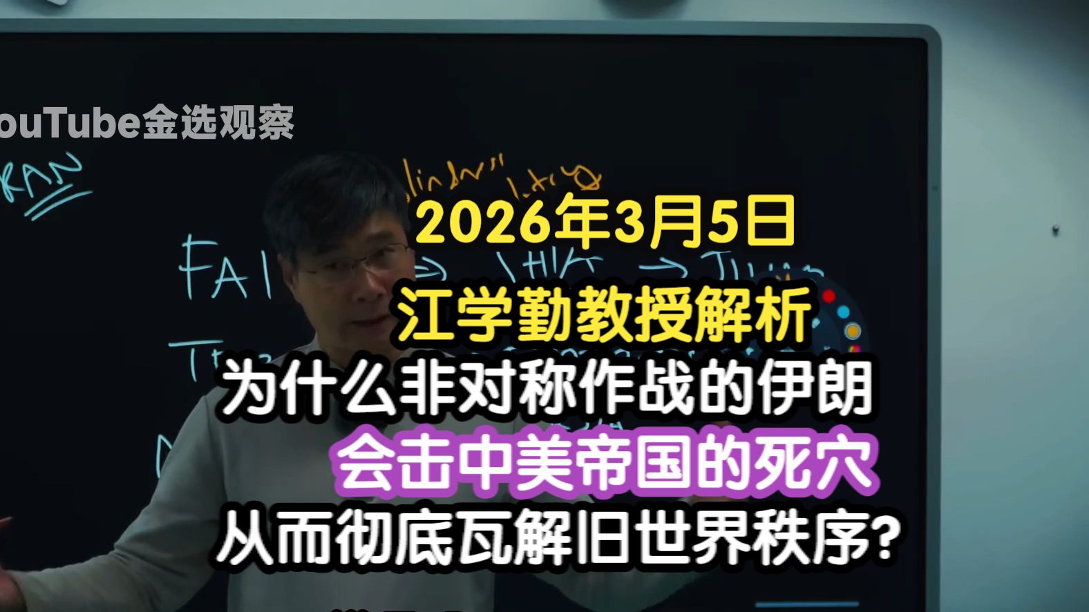 YouTube金选观察的视频 (二)2026年3月5日 江学勤教授解析:为什么非对称作战的伊朗,会击中美帝国的死穴,从而彻底瓦解旧世界秩序? (一)2026年3月4日 预测川普上台开战伊朗的江学勤教授用博弈论解析:这轮美伊战争为什么美国必败?