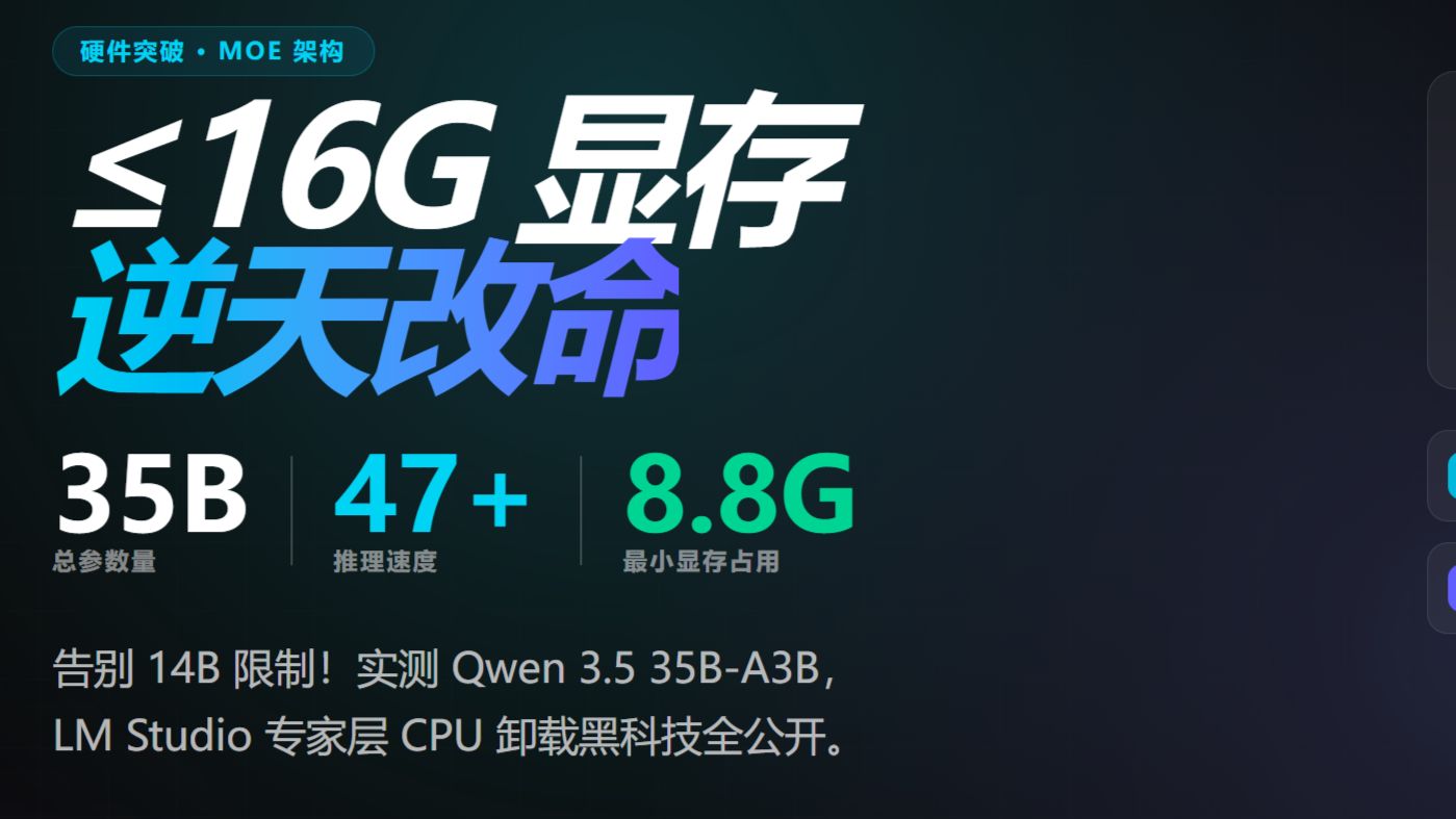 UP主: 封面: 简介:效果:以在RTX5080 16G Laptop上部署Qwen3.5 35B A3B为例,Q6模型的速度约30t/s以上,Q4模型的速度约45t/s以上,同时有128k上下文同时该模型的无审查版本还保留了较好的多...