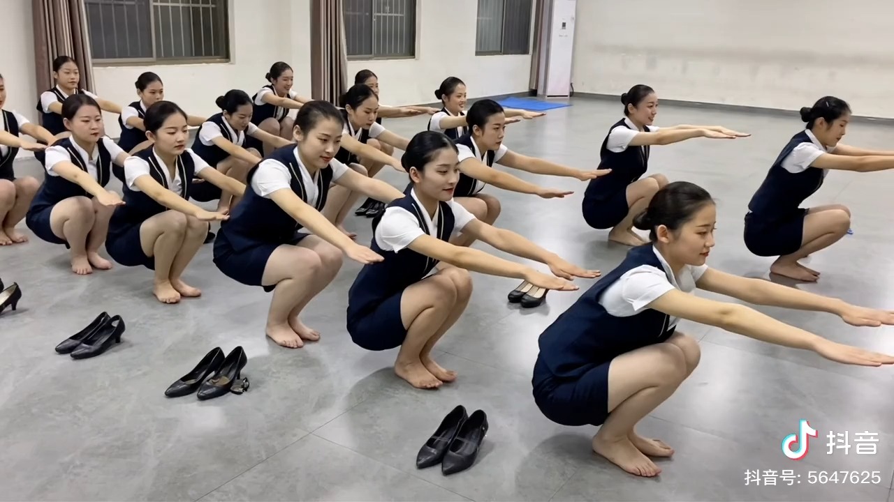 真实空乘学校上课 光脚练习深蹲