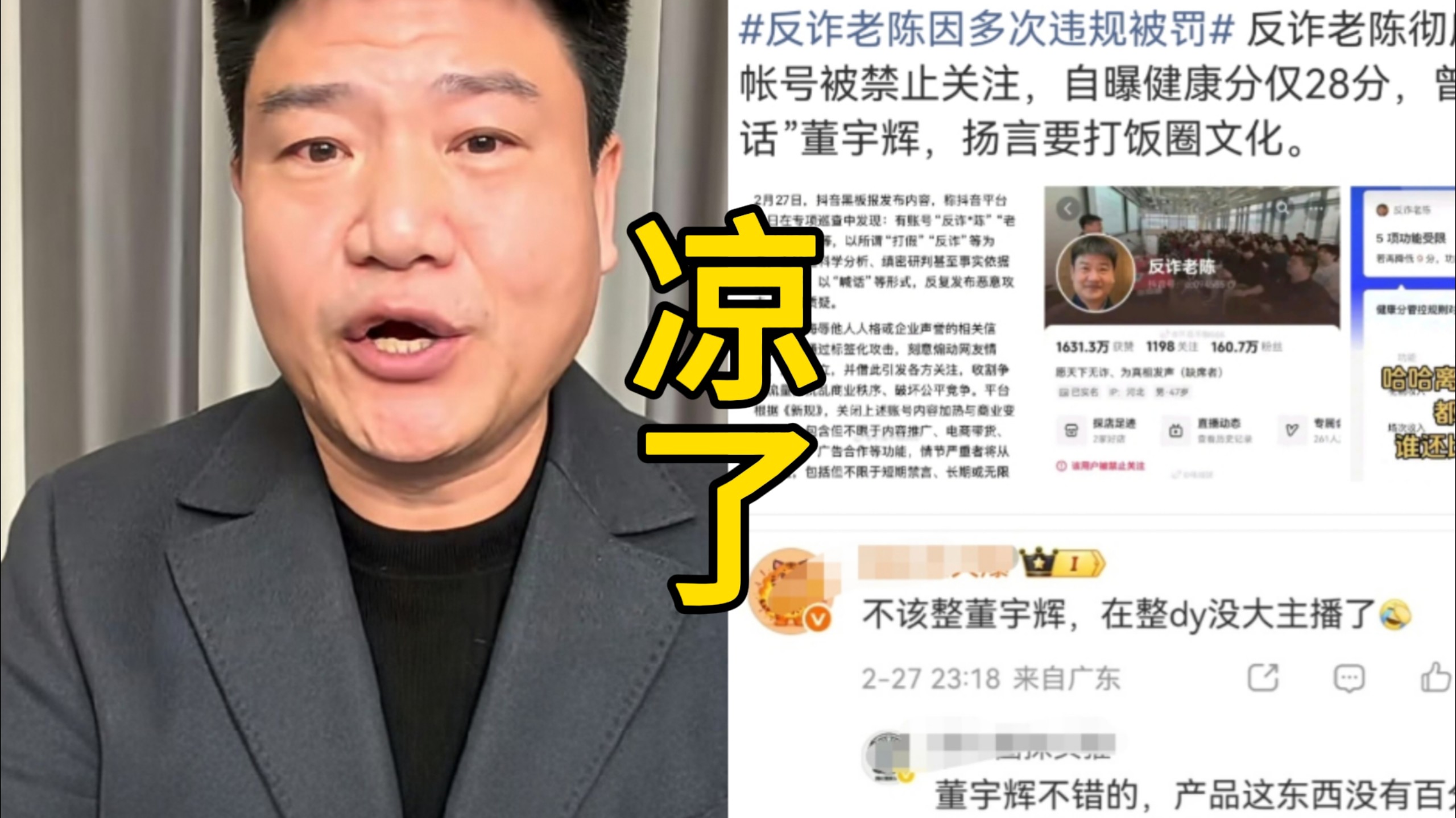 dy回应反诈老陈账号被罚冲上热搜,dy官方正面硬刚,反诈老陈彻底凉了,说他借着打假反诈的名头,没凭没据就恶意攻击企业和个人,网友辣评:不该动董的!