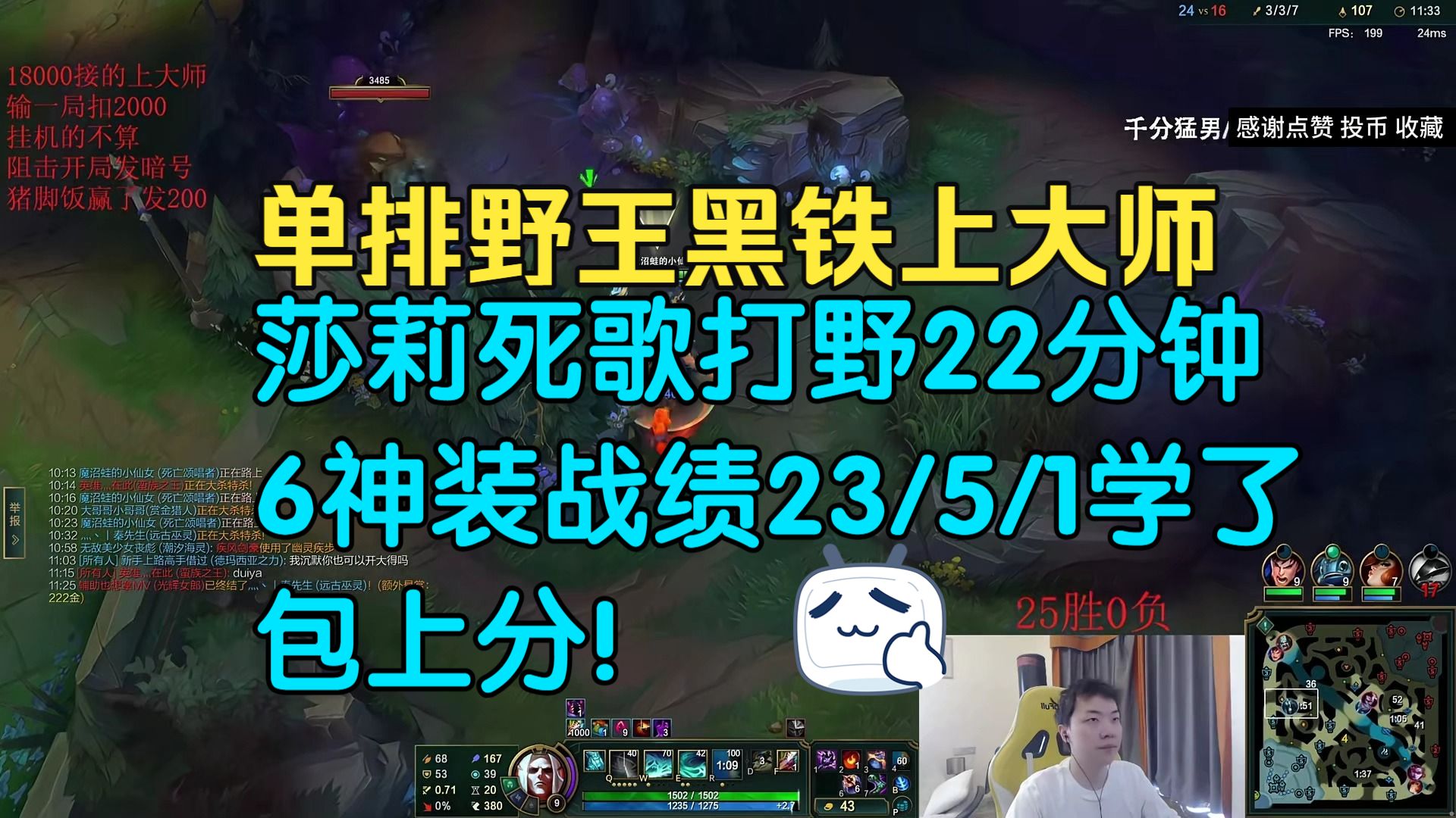 lol单排打野王黑铁上大师攻略!莎莉死歌打野22分钟6神装战绩23/5/1,学了包上分!莎莉直播回放莎莉录播!
