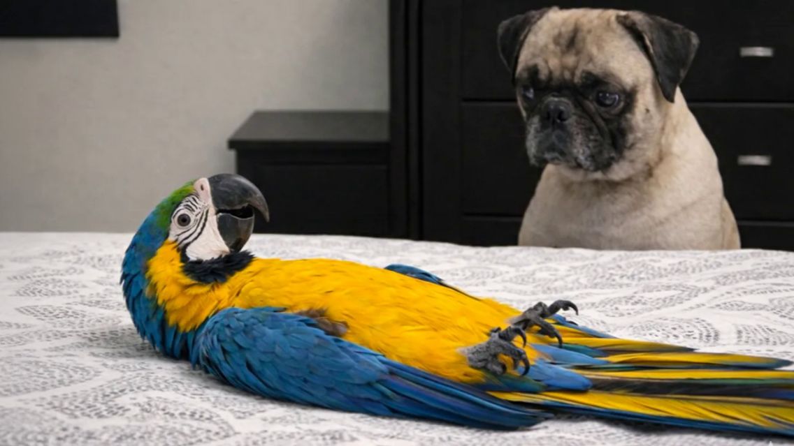会说话的鹦鹉取笑狗狗……狗狗只是盯着看😂 🦜🐶